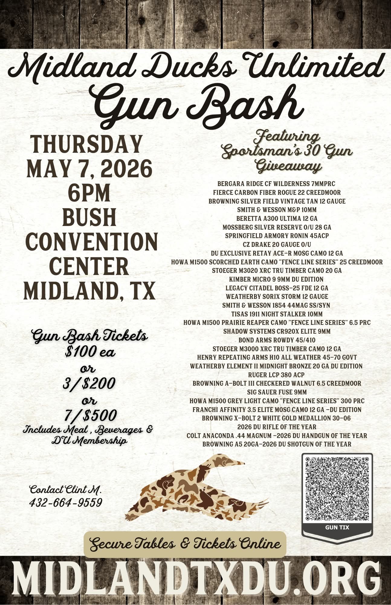 Midland Ducks Unlimited Spring Gun Bash. We will have about 75 guns and items to raffle and games to play. We will also have silent auction trips and hunts and one of a kind items. Help one of the top Chapters in Texas raise money for Wetlands Conservation